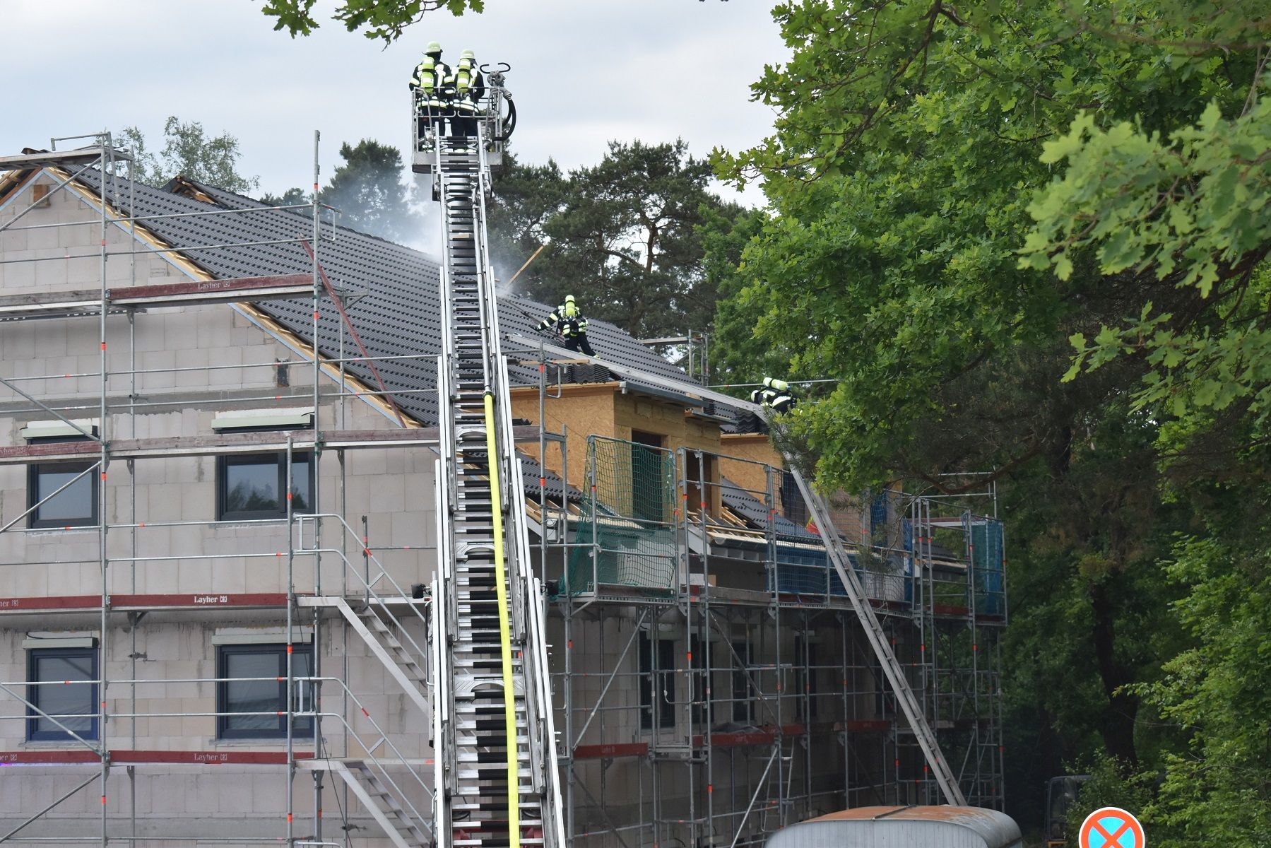 Bei dem Brandobjekt handelte es sich um ein Mehrfamilienhaus im Rohbau, bei dem gerade Dachdeckerarbeiten durchgeführt wurden. Beim Eintreffen der Feuerwehr war eine leichte Rauchentwicklung erkennbar. Die Bauarbeiter waren bereits auf der Suche nach dem Brandherd und wurden nach einer Übergabe an die Feuerwehr aus dem Gefahrenbereich gebracht. Glücklicherweise hatte sich keiner der Arbeiter verletzt.