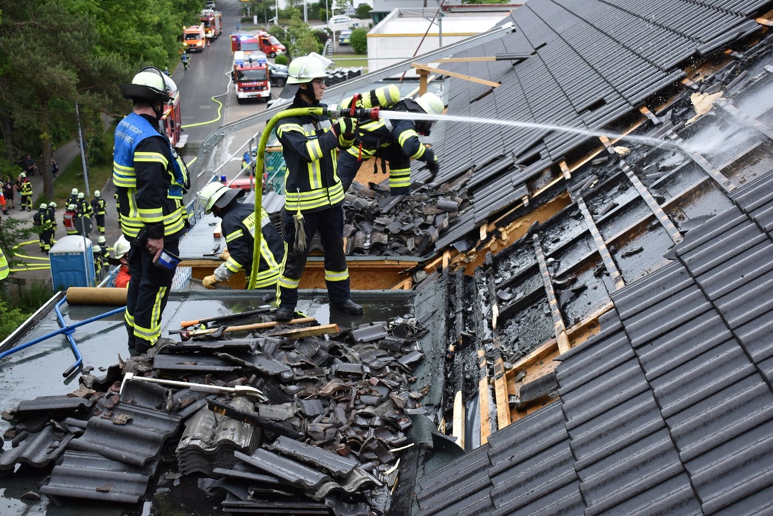 Für die Nachlöscharbeiten musste das gerade erst neu gedeckte Dach an einigen Stellen wieder abgedeckt werden, um die Brandstellen freizulegen. Das Baustellengerüst leistete dabei gute Dienste, da es als zusätzliche Arbeitsfläche zur Verfügung stand und ein sicheres Arbeiten ermöglichte.
