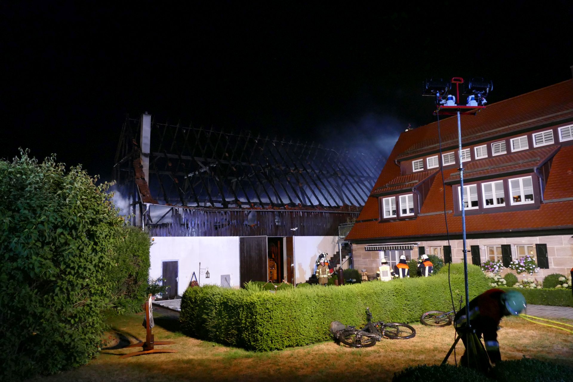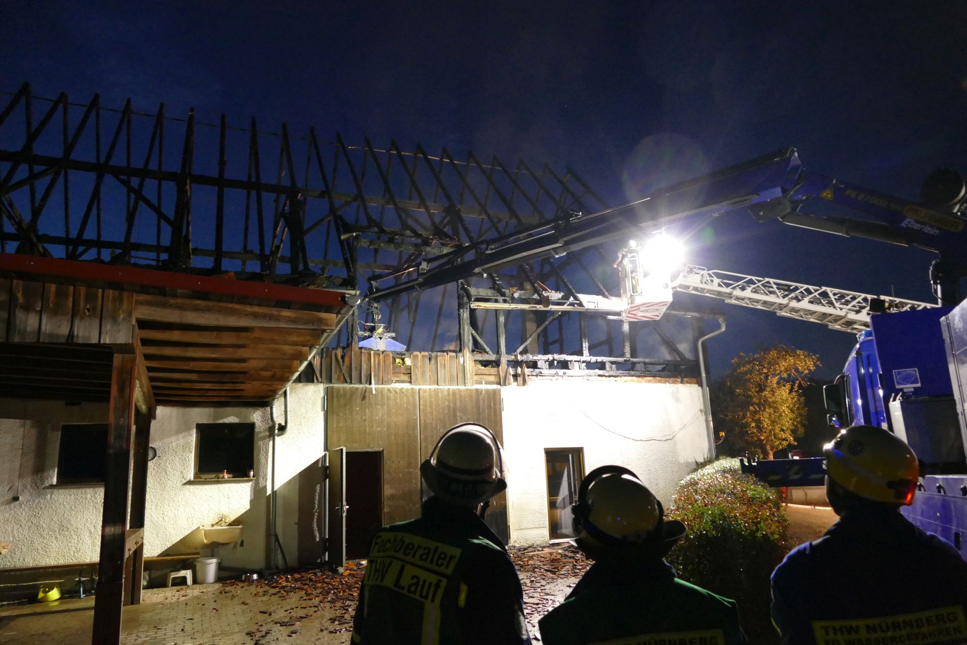 Nachdem das Feuer gelöscht war, begannen die aufwändigen Nachlöscharbeiten, bei denen im Verlauf des Einsatzes auch ein LKW mit Ladekran des THW Nürnberg zum Einsatz kam. Mit dessen Hilfe wurden Glutnester in der einsturzgefährdeten Scheune freigelegt um das Ablöschen dieser zu erleichtern. Auch die fachliche Meinung des Baufachberaters des THW Lauf wurde durch die Einsatzleitung herangezogen.