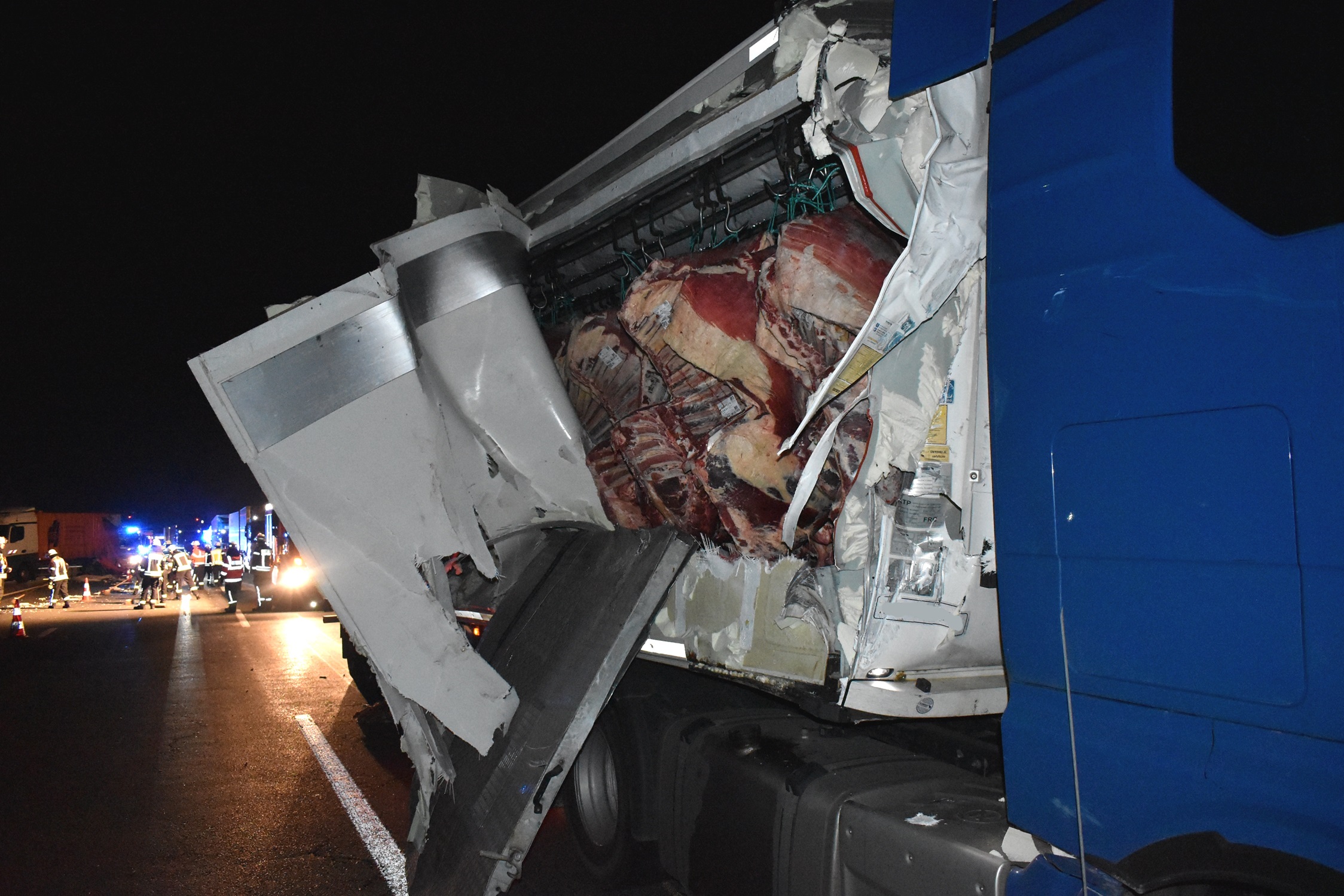 Der auffahrende LKW riss sich die Seitenverkleidung auf, wodurch Teile der Ladung – gekühlte Rinderhälften – auf die Fahrbahn fielen. Sowohl der Fahrer des LKW als auch die Baustellenarbeiter blieben glücklicherweise unverletzt.