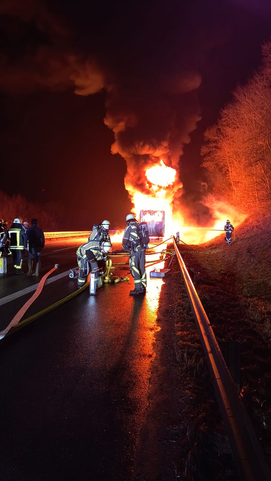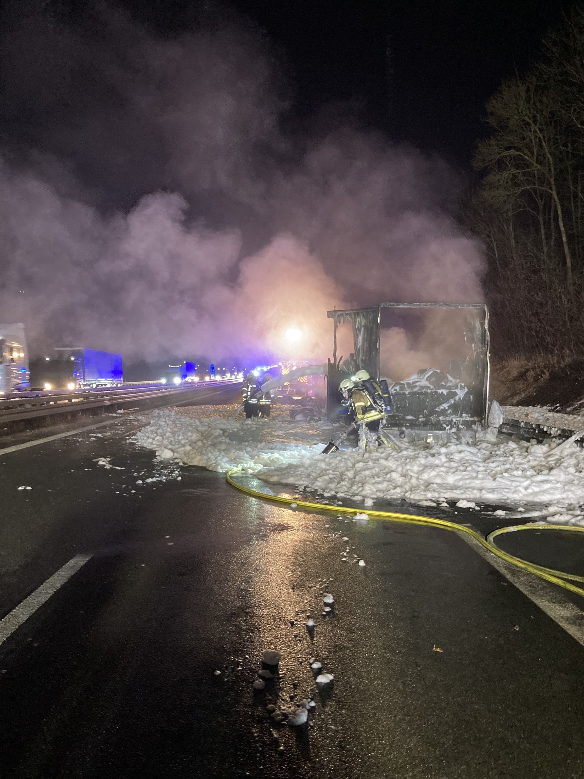 Am frühen Morgen des 25.02.2025 um 03:41 Uhr wurden die Feuerwehren Altdorf, Alfeld und Lauterhofen sowie die Kreisbrandinspektion Nürnberger Land zu einem Brand 2 auf die Autobahn 6 Fahrtrichtung Pilsen alarmiert. Zwischen den Anschlussstellen Altdorf/Leinburg und Alfeld wurde ein brennender LKW gemeldet. Das auf der Gegenfahrbahn anfahrende Führungsfahrzeug der FF Alfeld bestätigte die Alarmmeldung und meldete einen Sattelauflieger in Vollbrand. Nachdem die ersten Löschmaßnahmen eingeleitet wurden und weitere Erkundungen stattfanden, stellte sich heraus, dass der LKW Fahrer geistesgegenwärtig die Zugmaschine entkoppeln und in Sicherheit bringen konnte. Leider mussten wir feststellen, dass der Sattelauflieger mit Plastik-Transportkisten voll beladen war, was unsere Arbeit enorm erschwerte. Schnell war klar, dass die Löschmaßnahmen mit Wasser nicht ausreichten und man entschied sich, Schaummittel einzusetzen. Da auf der Autobahn, nicht wie innerorts, überall Hydranten zu finden sind, wurde ein Pendelverkehr eingerichtet und die Feuerwehr Feucht nachalarmiert. Nachdem das Feuer unter Kontrolle war, wurde mit Hilfe des THW´s aus Lauf Nachlöscharbeiten durchgeführt.