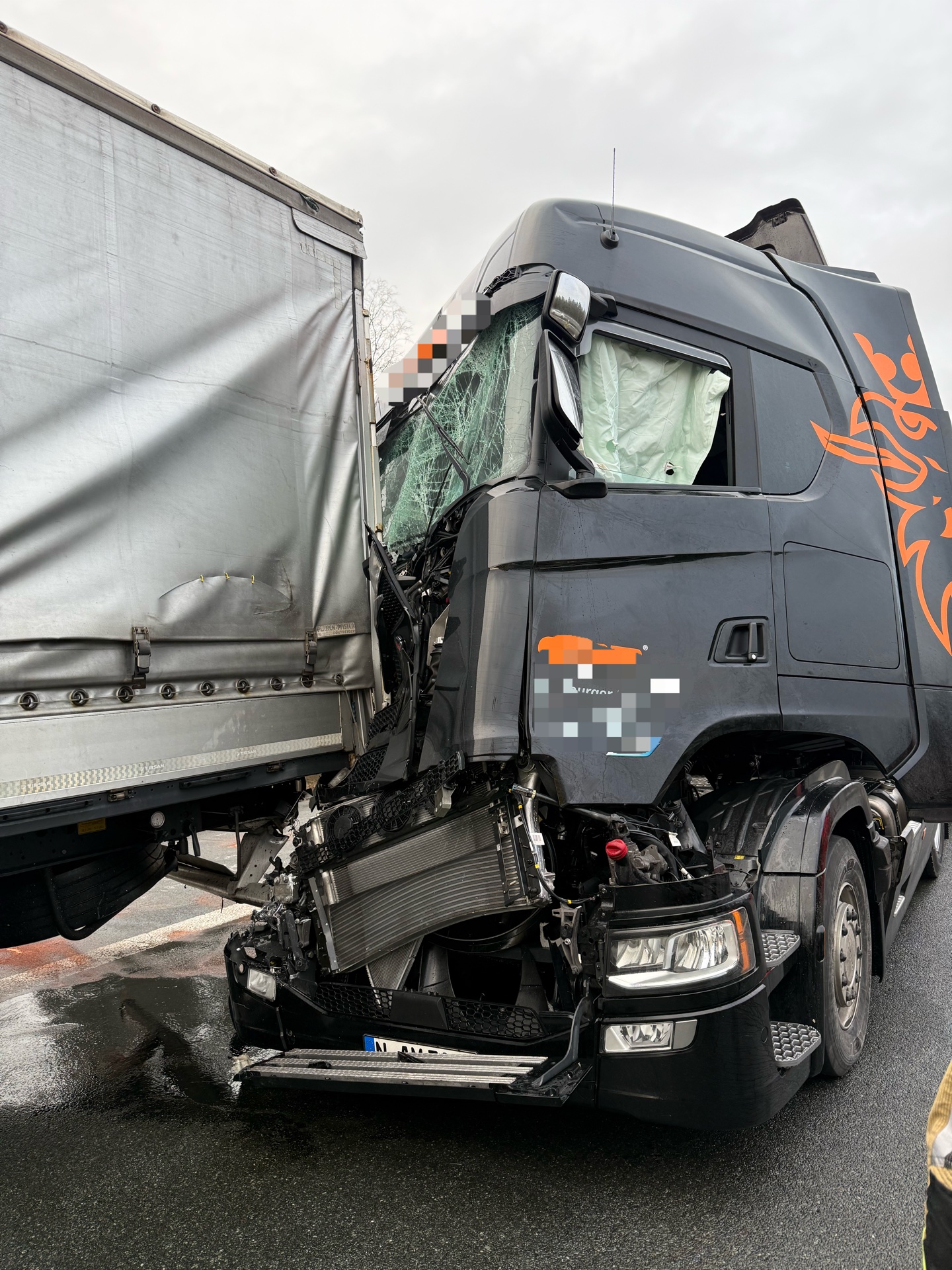 Dort noch nicht angekommen, kam über den Funkmeldeempfänger und per Funk die nächste Alarmierung. Einsatzstichwort THL 4 - Schwerer Verkehrsunfall mit 2 LKW´s, Person eingeklemmt, lautete die Meldung der Integrierten Leitstelle Nürnberg. Mittlerweile war das zweite Löschfahrzeug der Feuerwehr Altdorf wieder einsatzbereit und fuhr gemeinsam mit dem Rüstwagen die Einsatzstelle auf der Autobahn 6 an. Nach diesem großen Einsatzstichwort wurden auch die Feuerwehren aus Feucht, Röthenbach an der Pegnitz und Winkelhaid mit alarmiert. Des Weiteren wurden der Rettungsdienst, 2 Rettungshubschrauber, die Verkehrspolizei und das THW Lauf an die Einsatzstelle alarmiert. Der Unfall ereignete sich im Stauende des noch laufenden ersten Einsatzes. Nach ersten Erkundungen wurden 2 LKW´s festgestellt, der Fahrer des Auffahrenden LKW´s war in seiner stark deformierten Kabine eingeschlossen. Sofort begann die Feuerwehr Altdorf mit der Personenrettung mittels schwerem hydraulischen Gerät. Die Kameraden der mit alarmierten Feuerwehren unterstützten dabei und stellten zusätzlich den Brandschutz sicher, sicherten die Unfallstelle ab, indem das Autobahnkreuz Altdorf komplett gesperrt wurde und banden auslaufende Betriebsmittel ab. Zügig war der eingeschlossene Fahrer aus seinem Führerhaus befreit und an die Besatzung der beiden gelandeten Rettungshubschrauber übergeben worden. Im Anschluss mussten die beiden verkeilten LKW´s mittels Schneidbrenner voneinander getrennt werden. Die Bergung übernahmen der LKW-Bergedienst. Die Autobahnmeisterei sicherte die Unfallstelle im Anschluss ab, sodass die Feuerwehren diese verlassen konnten.