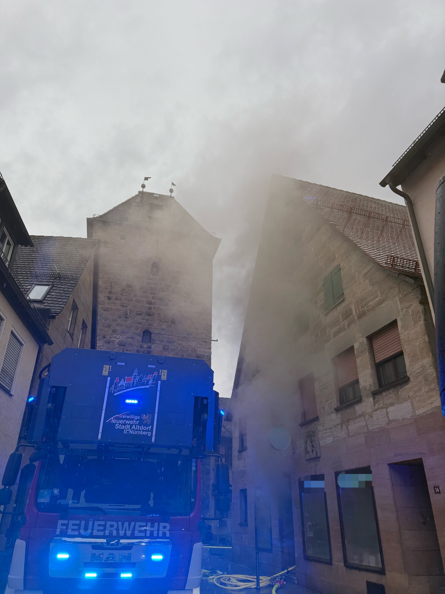 Die Ruhe hielt leider nicht lange an. Gegen 17 Uhr wurden die Feuerwehren aus Altdorf, Rieden und Röthenbach bei Altdorf sowie die Kreisbrandinspektion, der Rettungsdienst und die Polizei zu einem Brand 4 - Zimmerbrand auf den Oberen Markt alarmiert. Rasch wurde die Einsatzstelle durch den Einsatzleiter erkundet und man stellte eine Rauchentwicklung im Inneren des Gebäudes fest. 2 Trupps unter schwerem Atemschutz erkundeten das Innere des Hauses und mit weiteren 4 Trupps löschten Sie den Brand sowie vorgefundene Glutnester ab. Im Anschluss wurde das Wohn- und Geschäftshaus mittels Überdrucklüfter belüftet und an die Bewohner übergeben.