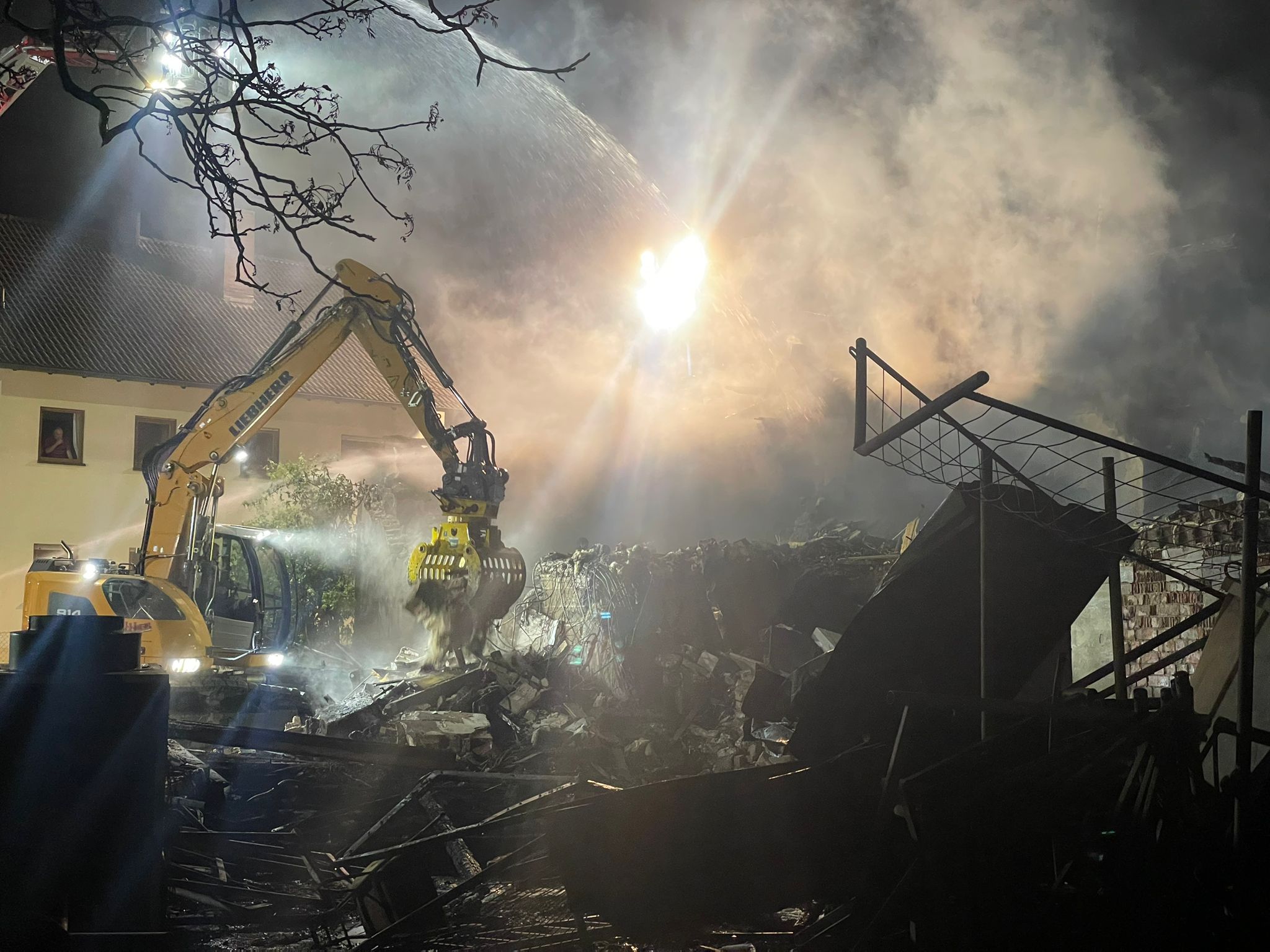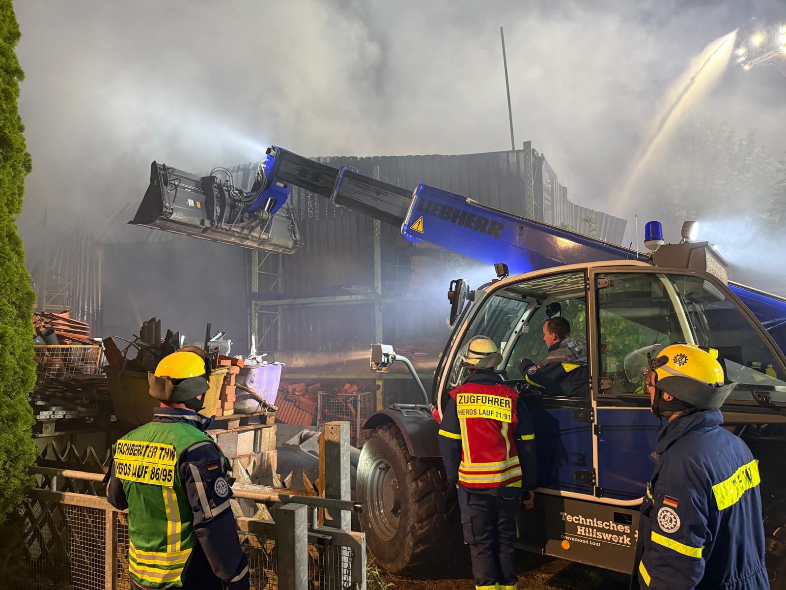 Zur Unterstützung der Löschmaßnahmen, die sich bis in die frühen Morgenstunden zogen, und zur Ausleuchtung der Einsatzstelle wurde das THW Lauf mit dem Teleskoplader alarmiert. Im späteren Verlauf mussten die Gebäude noch in der Nacht eingerissen werden, weshalb ein Bagger an die Einsatzstelle gebracht wurde.