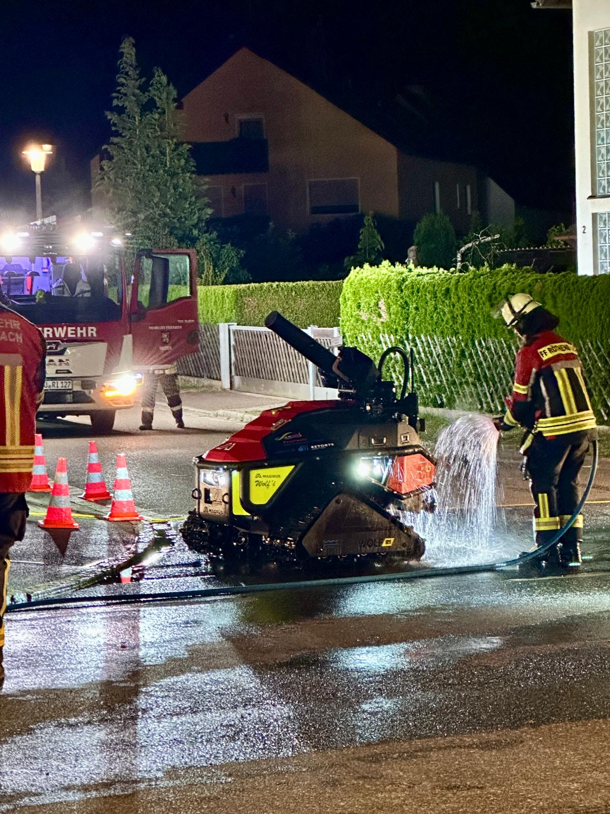Wegen der Bebauung und der Ausdehnung des Brandes kamen neben zahlreichen Strahlrohren auch zwei Drehleitern zur Brandbekämpfung zum Einsatz. Diese musste wegen der starken Rauchentwicklung unter Atemschutz erfolgen. Auch ein spezieller Löschroboter der Feuerwehr Röthenbach a. d. Peg. wurde an die Einsatzstelle gebracht und unterstützte die Löscharbeiten. Es war der erste Einsatz dieses erst in der vergangenen Woche übergebenen Einsatzmittels, das sich hier bereits als sehr wertvolle Ergänzung erwiesen hat.