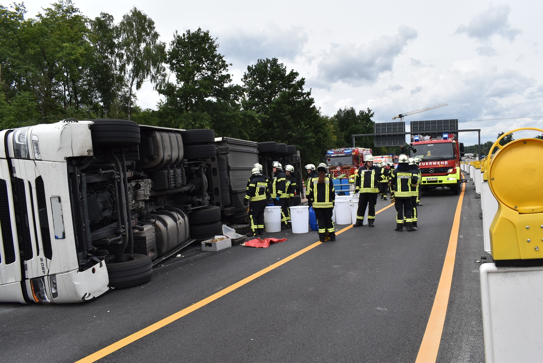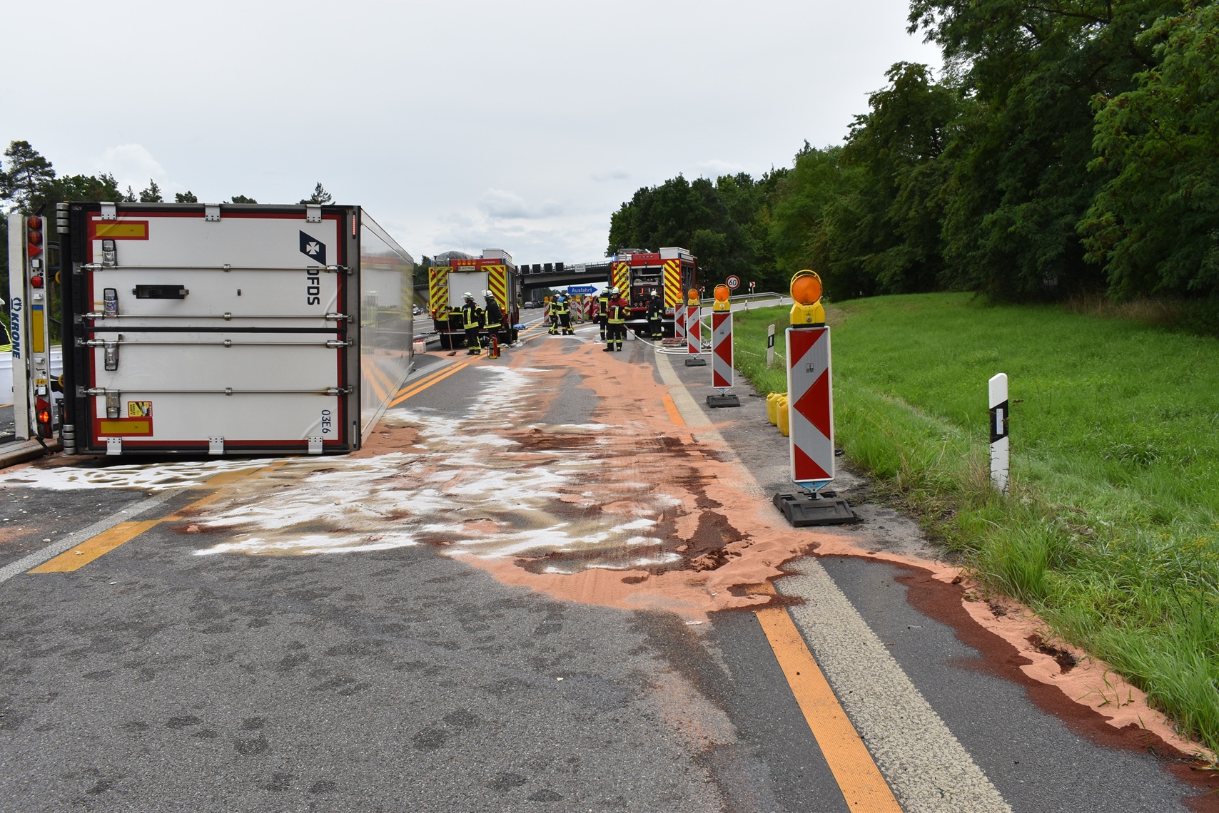 Die wenige Minuten später eintreffenden ersten Feuchter Fahrzeuge fanden dann den LKW, der bei der Ausfahrt von der Rastanlage im Baustellenbereich eine Abtrennung gestreift hatte und dadurch umgestürzt war. Der Fahrer konnte sein Fahrzeug unverletzt verlassen, jedoch war der Dieseltank des Kühlaggregats des mit Lebensmitteln beladenen Tiefkühlaufliegers beschädigt. Dadurch traten große Mengen Treibstoff aus und verteilten sich großflächig über die Fahrbahn.