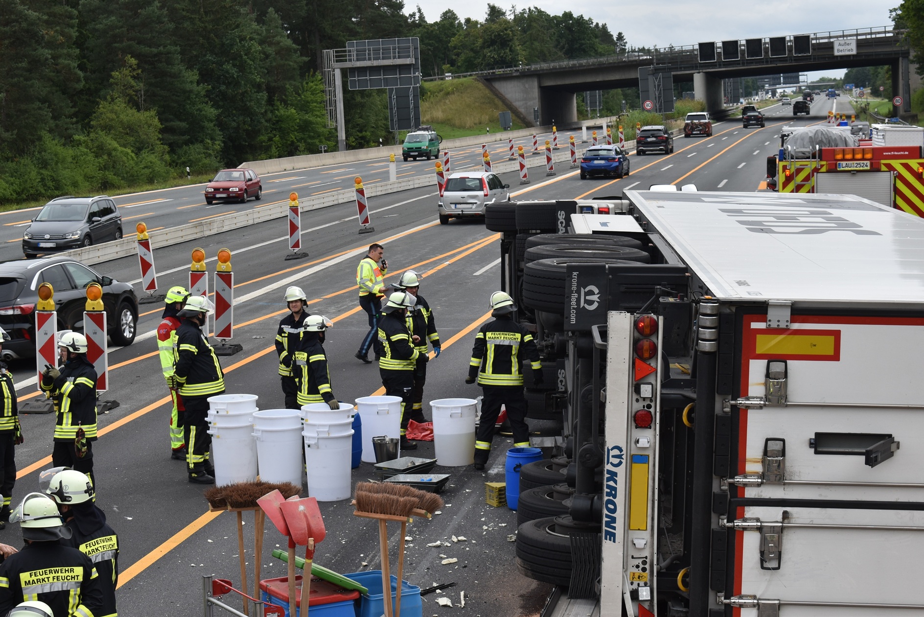 Zu einem umgestürzten LKW auf der A9 wurde die Freiwillige Feuerwehr Markt Feucht am Nachmittag des 02.08.25 um 14:35 Uhr alarmiert. Da die Einsatzstelle zunächst zwischen dem Autobahndreieck Feucht und der Anschlußstelle Allersberg gemeldet war, waren auch die Feuerwehren Röthenbach b. St. Wolfgang und Wendelstein mit auf dem Weg.