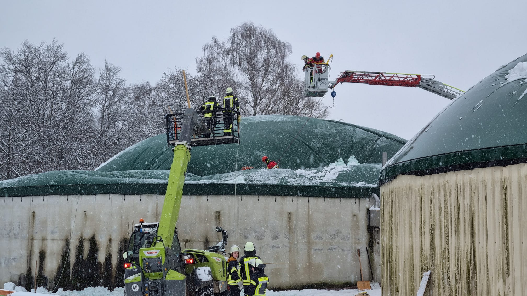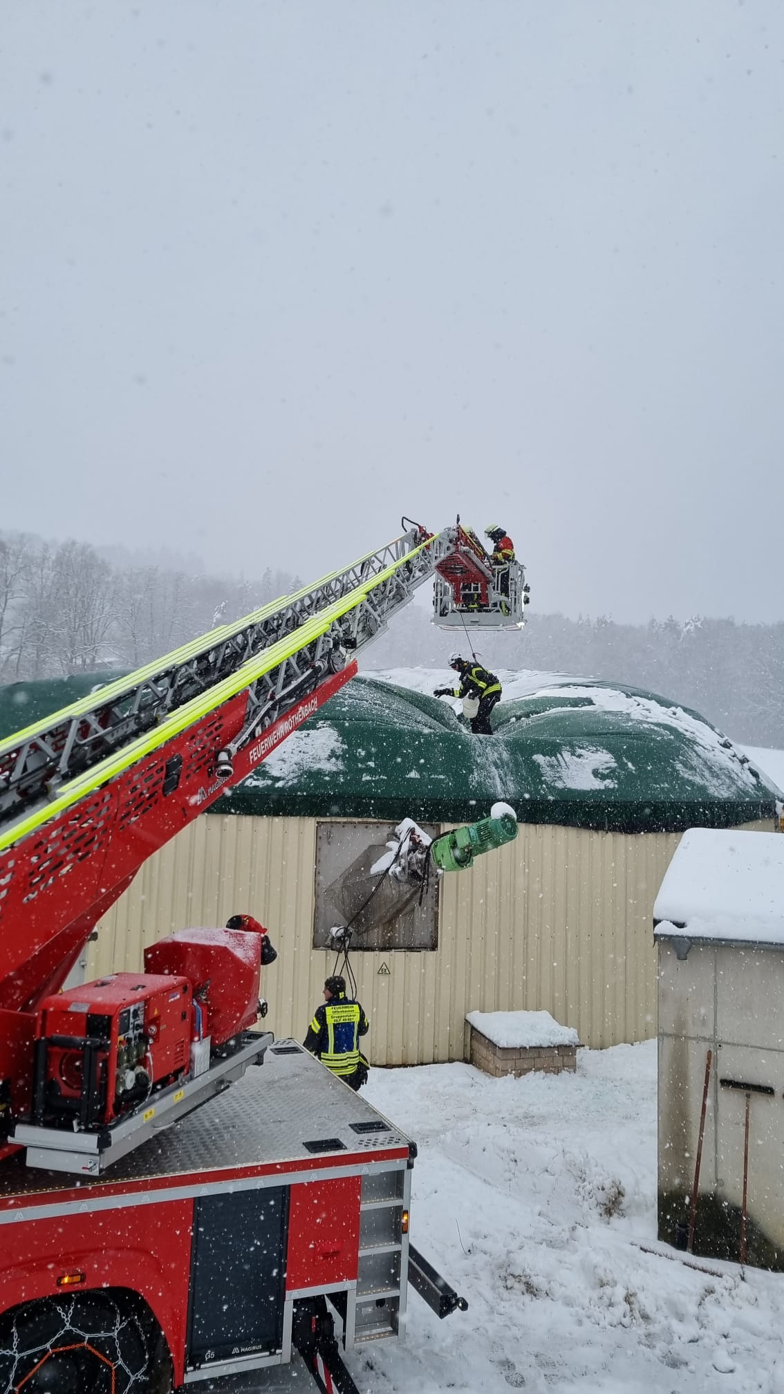 Bereits gegen 06:45 Uhr wurden die Feuerwehren Kucha und Altdorf b. Nürnberg alarmiert. In Püscheldorf drohten die Tragluftdächer einer Biogasanlage durch die Schneelast einzustürzen und einzureißen. Da durch die Biogasanlage viele Haushalte in Püscheldorf mittels Fernwärme versorgt werden, war es wichtig, diese in Betrieb zu halten. Deshalb entschied man sich dazu, die Dächer zu räumen und veranlasste eine entsprechende Nachalarmierung.