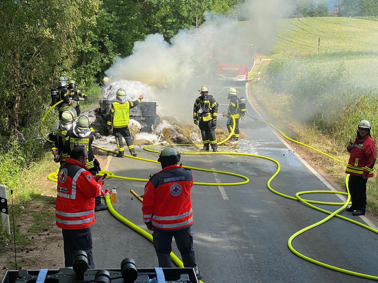 Speikern (DB 2) - Am Mittag des 18. Juni 2022 kam es auf der Staatsstraße 2236 zwischen Speikern und Rollhofen aus noch unerklärter Ursache zu einem Vollbrand eines landwirtschaftlichen Anhängers, auf dem ein Landwirt eine größere Anzahl an Heuballen geladen hatte. Er bemerkte den Brand früh und kuppelte den Anhänger ab. So konnte er die Zugmaschine aus dem Gefahrenbereich bringen.