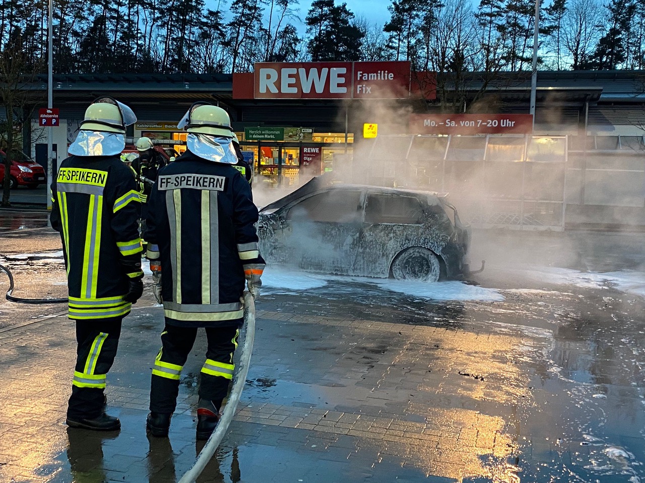 Speikern (DB2) - Am frühen Montagmorgen des 21. Februar 2022 kam es zu einem Fahrzeug-Vollbrand auf dem Kundenparkplatz des REWE-Marktes in Speikern. Mitarbeiter des Lebensmittelmarktes bemerkten eine Rauchentwicklung und erste Flammen im Motorraum des älteren Fahrzeuges und alarmierten umgehend die Feuerwehr.