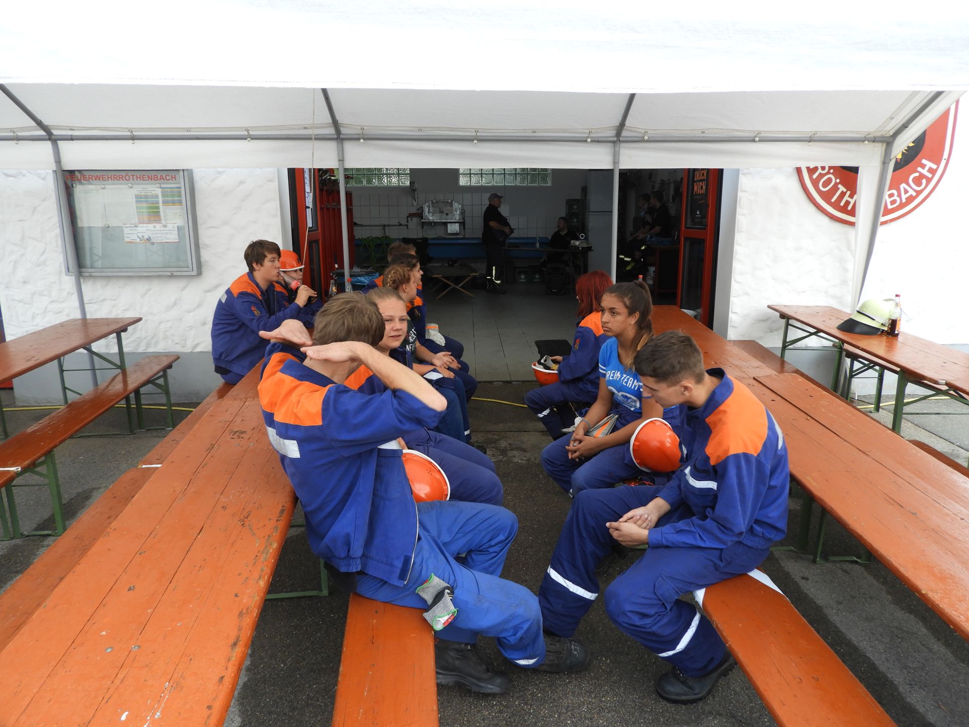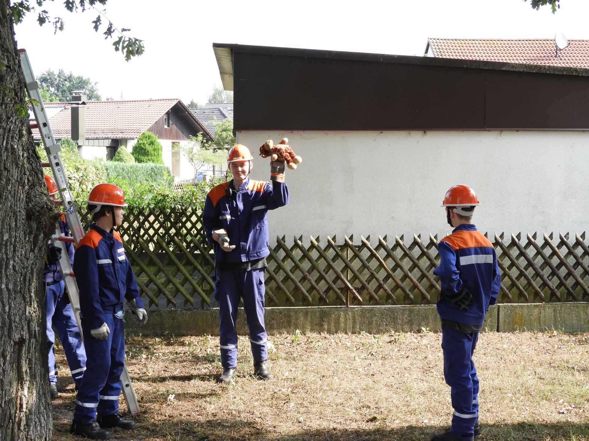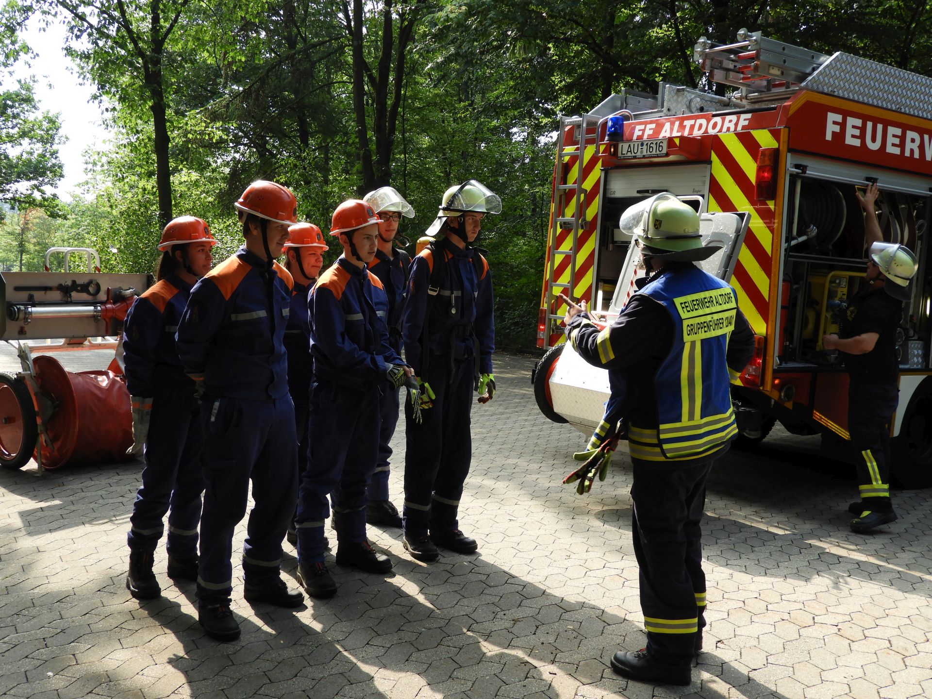 Die Jugendgruppen aus Röthenbach, Rieden und Altdorf fanden sich am Samstag Morgen auf der Feuerwache ein um diese zu beziehen und die Diensteinteilung zu erhalten. Nach dem Antreten wusste jeder wie sein Dienstplan bis Sonntag aussieht. Schon folgte der erste Einsatz. Es galt Tiere von einem Baum zu retten. Dieser wurde gerade erfolgreich abgearbeitet, da folgte schon der nächste. Einen Mülltonnenbrand galt es abzulöschen. Nachdem auch das erfolgreich abgeschlossen werden konnte, rückten die Fahrzeuge wieder ein. Nun galt es etwas zu lernen. Eine Erste Hilfe Ausbildung, abgehalten von 2 Kameraden, die sich ebenfalls noch beim Roten Kreuz engagieren, stand auf dem Plan. Währenddessen, erneut ein Alarm. Einer verletzten Person galt es zu helfen bis der Rettungsdienst eintraf. Auch diese Aufgabe wurde gemeistert und alle haben sich Ihr Mittag redlich verdient. Nachdem weitere Einsätze abgearbeitet wurden, u.a. eine Ölspur, ein Kleinbrand und eine Tierrettung, trafen die Eltern der teilnehmenden Jugendlich ein. Die Jugendfeuerwehr musste bei den nächsten Einsätzen Ihr können vor den Eltern unter Beweis stellen. Es galt eine Peron mittels Drehleiter von einem Balkon zu retten und diese medizinisch zu betreuen. Doch dies war gar nicht so einfach, weil in dem Objekt der Heizungskeller explodiert war. Nach erfolgreichem abarbeiten des Einsatzes wurde für die Eltern das Abendessen vorbereitet. Viele Salate wurden gemacht und der Rollbraten brutzelte. Diese Zeit wurde genutzt um eine Einsatznachbesprechung vor den Eltern abzuhalten. Nach Lob der Jugendwarte gab es noch ein besonderes Ereignis. Zwei Mitglieder der Kinderfeuerwehr wurden durch den ersten Kommandanten der Feuerwehr Altdorf an die Jugendwarte der Feuerwehr Altdorf übergeben. Diese werden in den nächsten 6 Jahren viele Ausbildungen in der Jugendfeuerwehr erhalten. Nach der Stärkung ging ein Alarm vom Freibad in Altdorf ein. Personen drohen zu ertrinken. Nach dem Eintreffen wartete schon die Wasserwacht um uns eine Ausbildung in der Wasserrettung zu geben. Wir wurden erst theoretisch und dann auch praktisch unterwiesen. So konnten die Jugendlichen bei bestem Wetter das kühle Nass genießen. Anschließend erneut ein Alarm. Eine Person war verschüttet. Diese wurde mittels Hebekissen gerettet. Im Anschluss gab es eine Ausbildung im Löschen von Flüssigbränden mittels Feuerlöscher. Im Anschluss war die Nachtruhe angebrochen. Doch diese hielt nur kurz. Personen wurden in der Röthenbach Klamm vermisst. Nach dem auch dieser Einsatz mit Erfolg abgearbeitet wurde, hieß es erstmal frühstücken. Nun wurde aufgeräumt, geputzt und gewischt, sodass die Einsatzbereitschaft wieder vollständig hergestellt war.