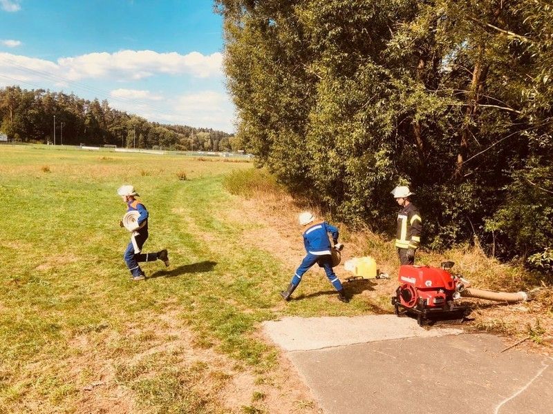 Bei der anspruchsvollsten Aufgabe der Jugendflamme Stufe 3 galt es einen Schaumangriff aufzubauen. Hierbei mussten Hindernisse wie ein Wassergraben beim Verlegen der Schlauchleitung überwunden werden.